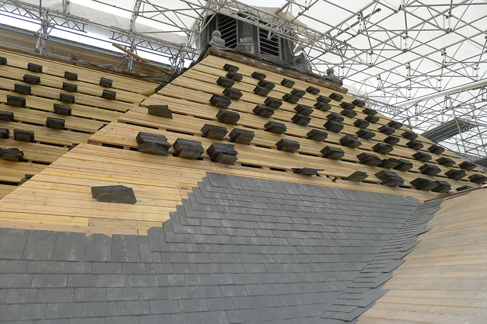 Restauration des façades en pierre de taille. Restauration des galeries après renforcement des planchers, sols en pierre et terre cuite, plafonds en plâtre. Restauration des toitures, consolidation de charpente, couverture en ardoise.