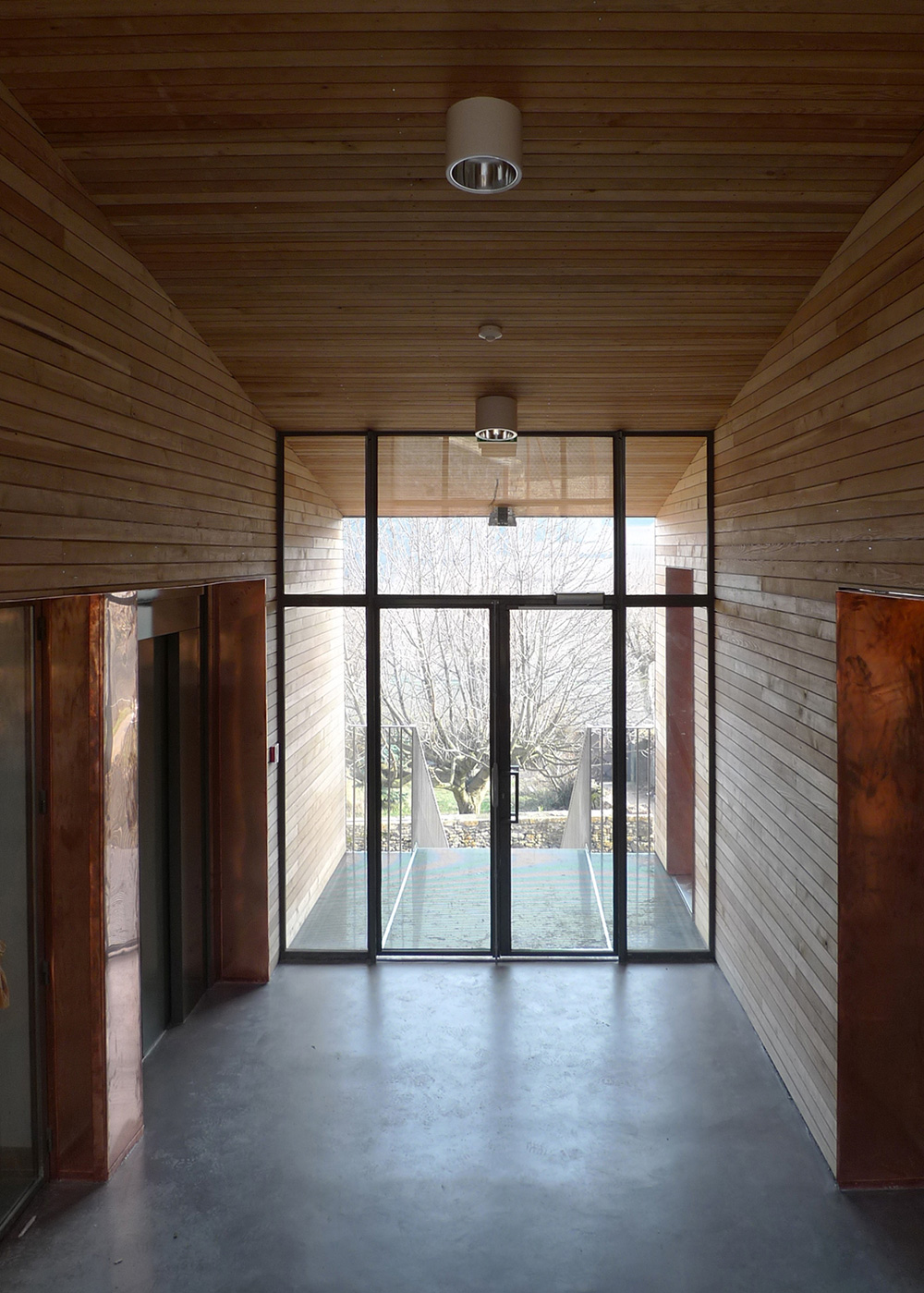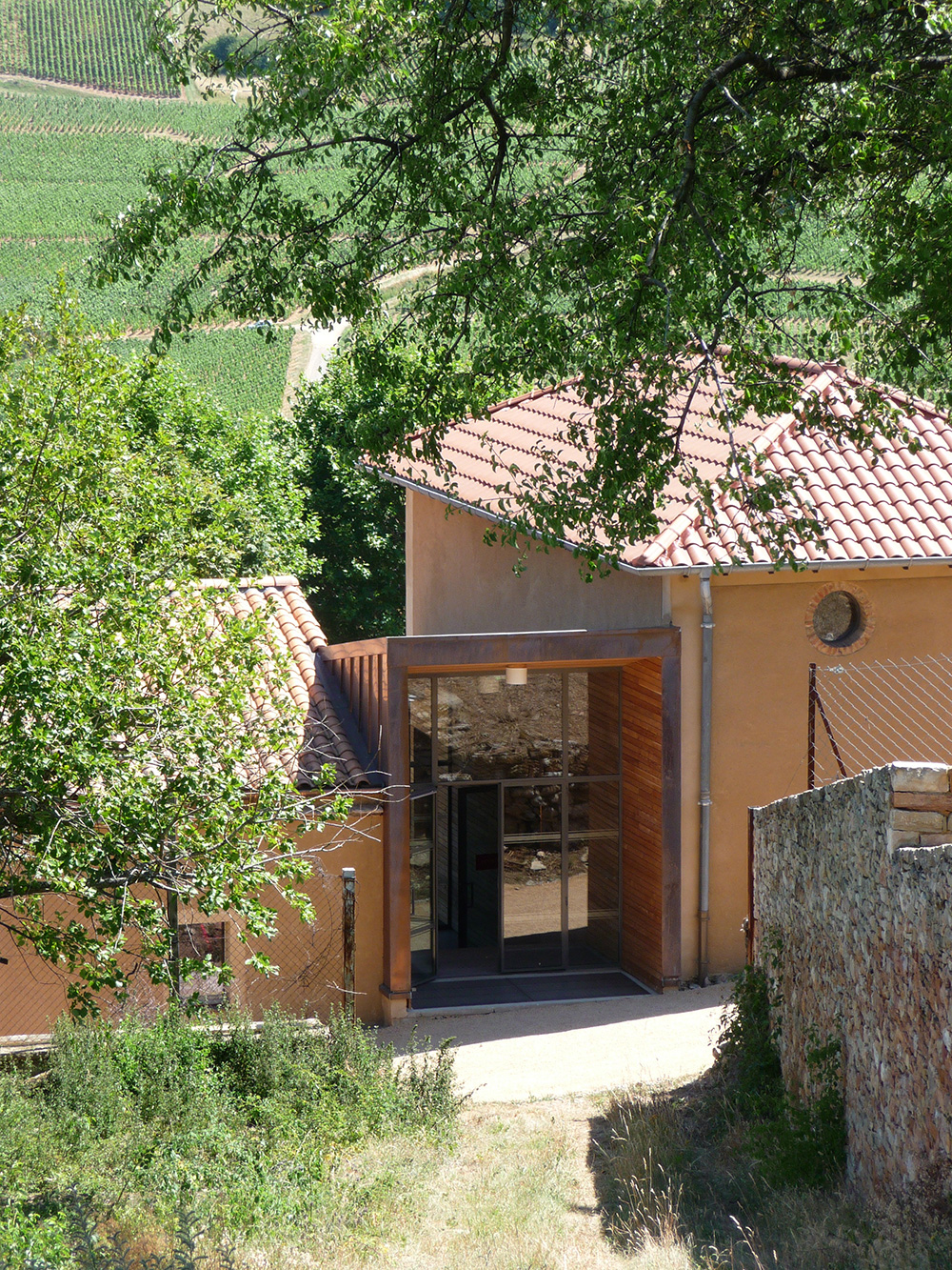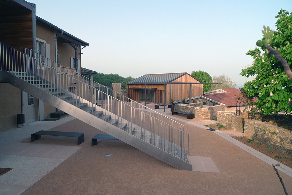 Le grand site naturel de Solutré - Pouilly - Vergisson avait besoin d’espaces d’accueil des visiteurs et de salles pédagogiques, essentiellement destinées au public scolaire porteur de handicap. La reconversion valorise l’intérêt patrimonial de cette ancienne exploitation viticole tout en l’adaptant aux contraintes d’un établissement recevant du public. Un grand hall d’accueil traversant est créé dans la continuité du parcours des randonneurs. Il débouche sur un escalier métallique monumental qui donne accès à la cour principale, en terrasse. Le vocabulaire contemporain s’exprime également dans l’extension en bois, nécessaire pour la mise en accessibilité, les expositions et un espace de petite restauration, type snack. Au-delà de la volonté de réutilisation, le choix de conforter la structure d’une grange plutôt que de la détruire, l’usage de mélèze non traité, de pompes à chaleur et d’une isolation thermique renforcée manifestent l’engagement du maître d’ouvrage dans une perspective de développement durable. Les cours et terrasses extérieures sont traitées sobrement en pierre et terrain compacté, agrémentées d’une tonnelle, de plantes vivaces et d’arbres de cour.
