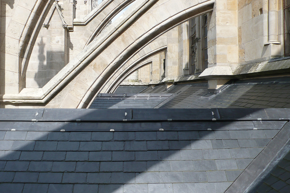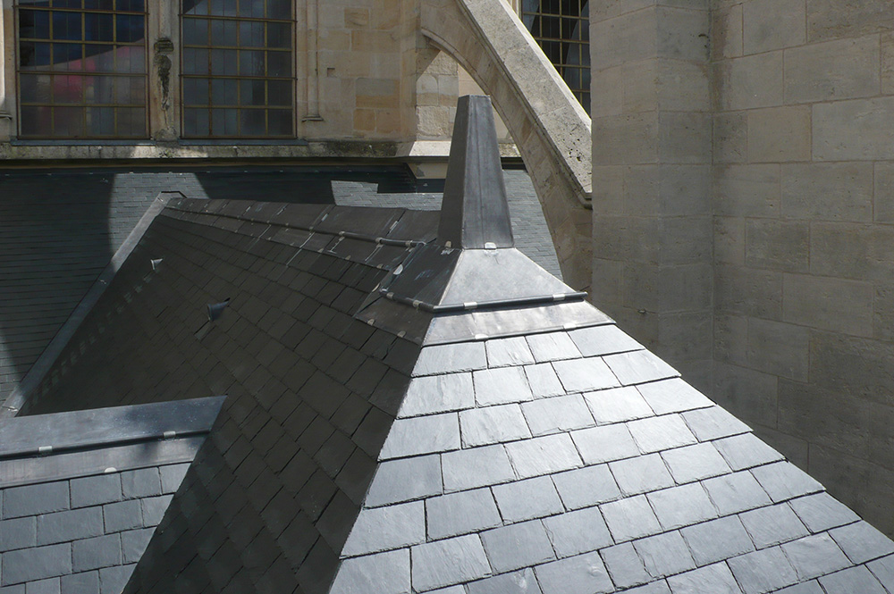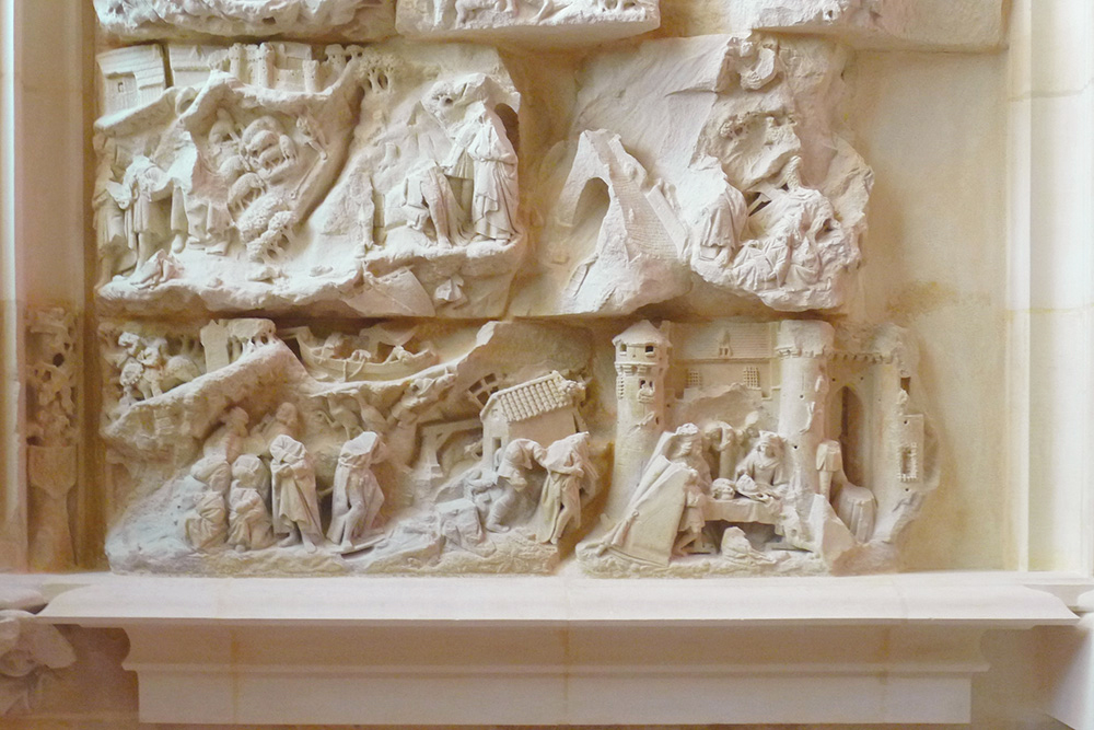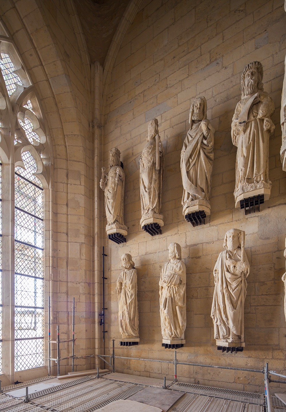 Restauration du clocher sculpté, scénographie de sculptures monumentales déplacées à l’intérieur du clocher, restauration des bas-côtés nord du chœur gothique, présentation d’un retable en pierre, et réintégration de stalles restaurées.