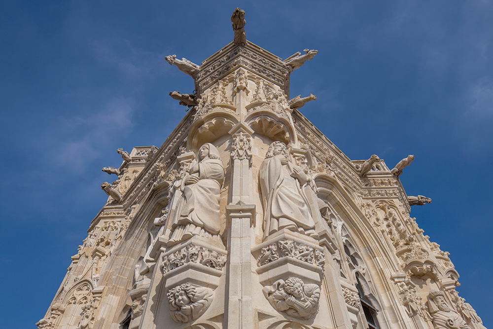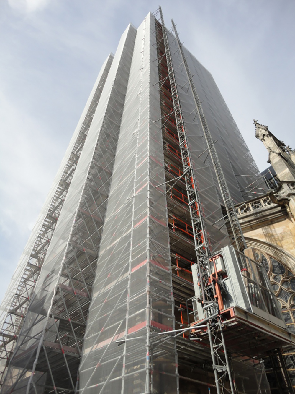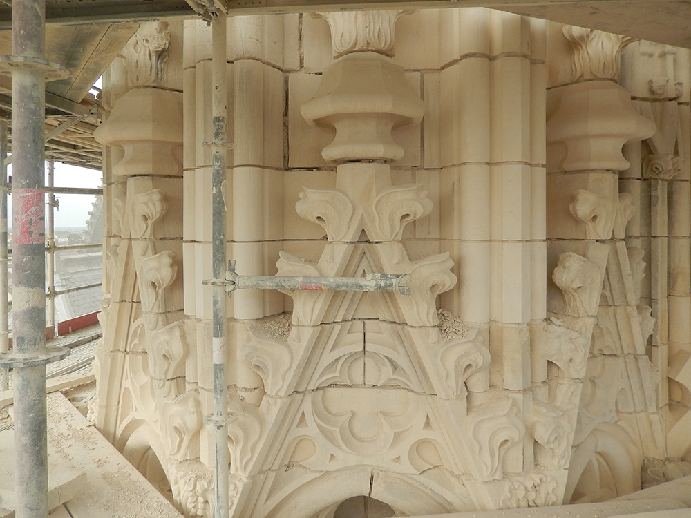 Il s’agit de la première opération non consécutive aux dommages de guerre sur cette cathédrale. L’architecture du clocher sculpté se plie au programme iconographique, fonction habituellement dévolue aux portails.