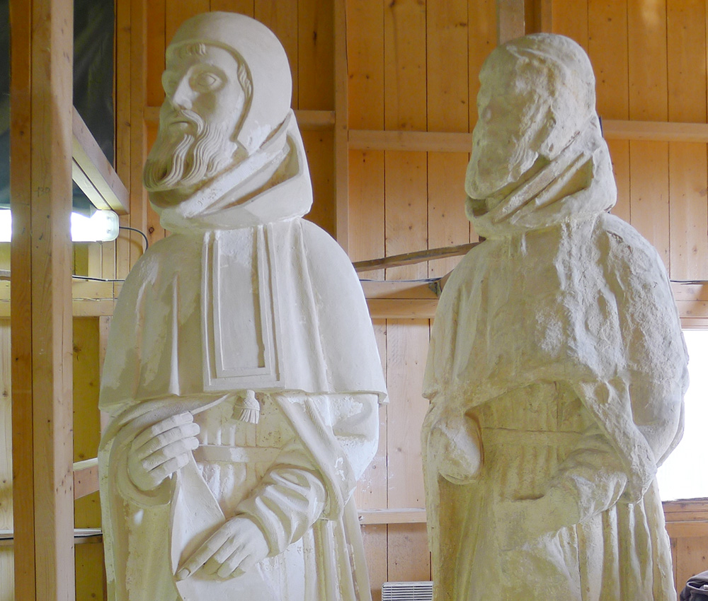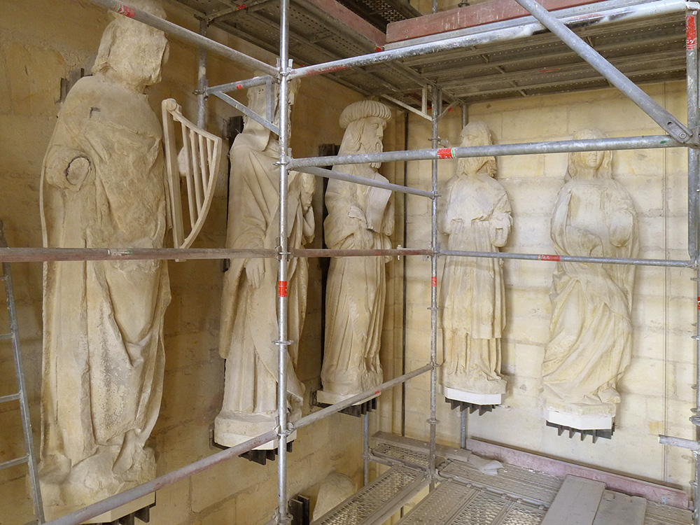 Parmi trois solutions de restauration des statues (remplacement par moulages à l’identique, sculptures contemporaines, dépose sans remplacement), celle du moulage avec complément des lacunes a été retenue. L’opération est en plusieurs étapes :