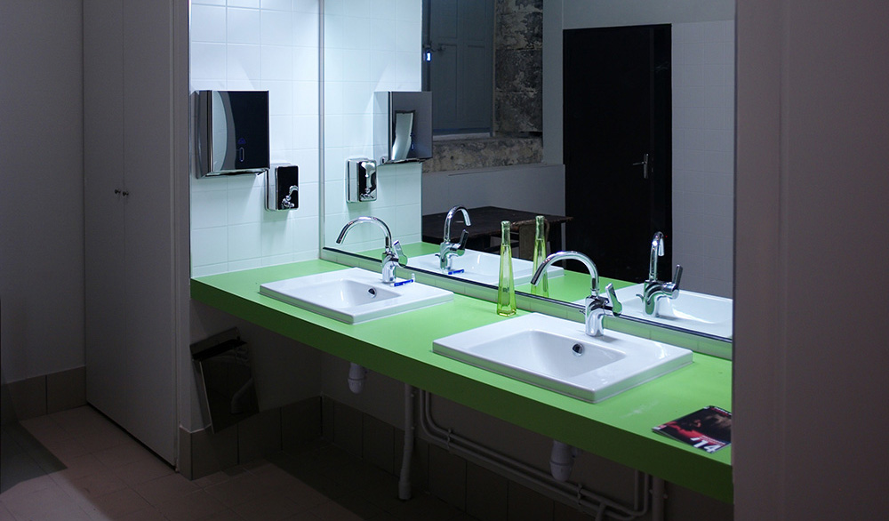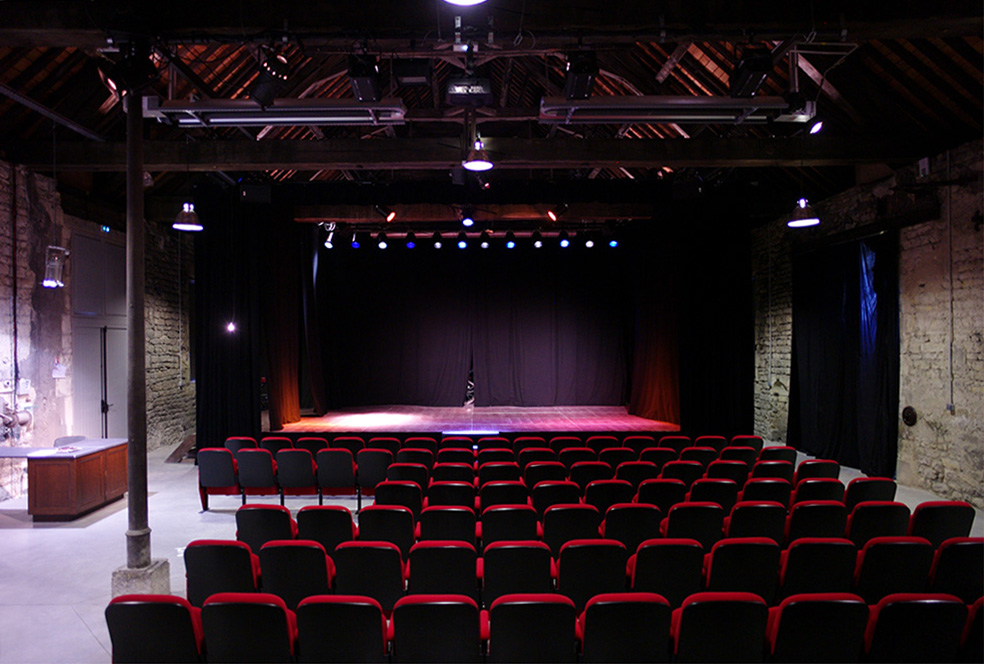 Des blocs à l’arrière de la scène regroupent les loges et les sanitaires. Le mobilier scénique, mobile, peut être démonté, libérant l’espace pour des expositions ou autres usages.